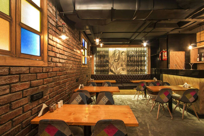 This 1800 sq. ft café/hookah lounge spreads across three areas i.e., mezzanine, ground and basement. Our client’s brief was to create a warm space that appealed to those looking to enjoy a daytime beer or to unwind with an evening sheesha. The design of the whole area is a juxtaposition of vintage , industrial, rustic and hints of Moroccan design style. As a focal point on the ground floor, we created a large chalkboard paint wall with renderings of food and sheesha elements in white. The wall design conceals a window opening framed in wood to the kitchen area, which displays their menu specials when not in use. Open electrical conduits, exposed brick wall and ac ducting, IPS flooring, cement finish wall coverings along with wire mesh hanging lights and pipe lights, all evoke a very industrial and rustic feel in the space.